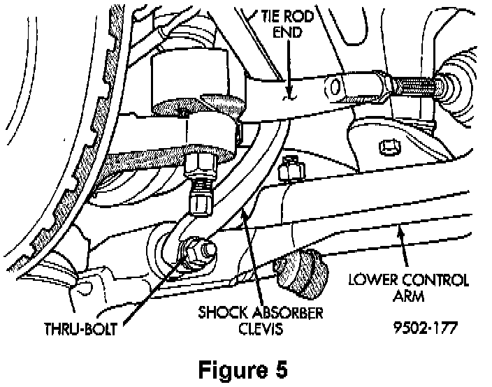 4. Remove the shock absorber (front strut) clevis to lower control arm bushing thru-bolt (Figure 5). Separate the clevis from the lower control arm.