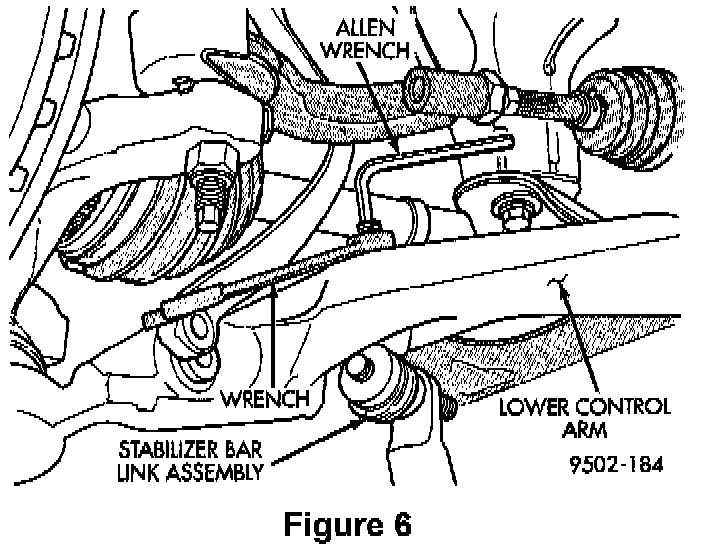 6. Remove the nut that attaches the stabilizer bar link to the lower control arm (Figure 6). When removing the nut, keep the stabilizer bar link stud from turning by inserting an allen wrench into the end of the stud.