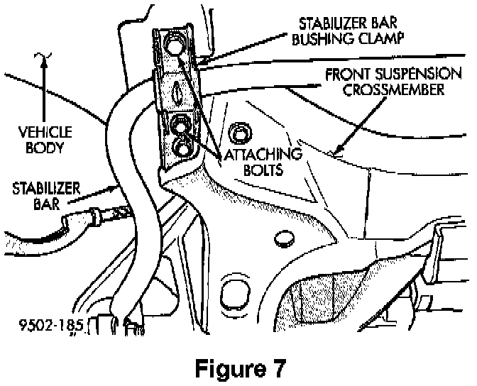 17. Align the stabilizer bar bushing clamp with the mounting holes in the front suspension crossmember and body (Figure 7). Loosely install the bushing clamp bolts.
