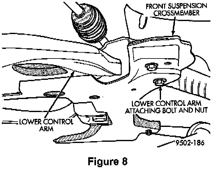 9. Remove the nut and bolt that attach the rear of the lower control arm to the front suspension crossmember (Figure 8).