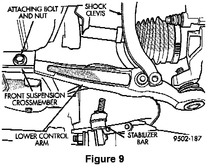 10. Remove the nut and bolt that attach the front of the lower control arm to the front suspension crossmember (Figure 9).
