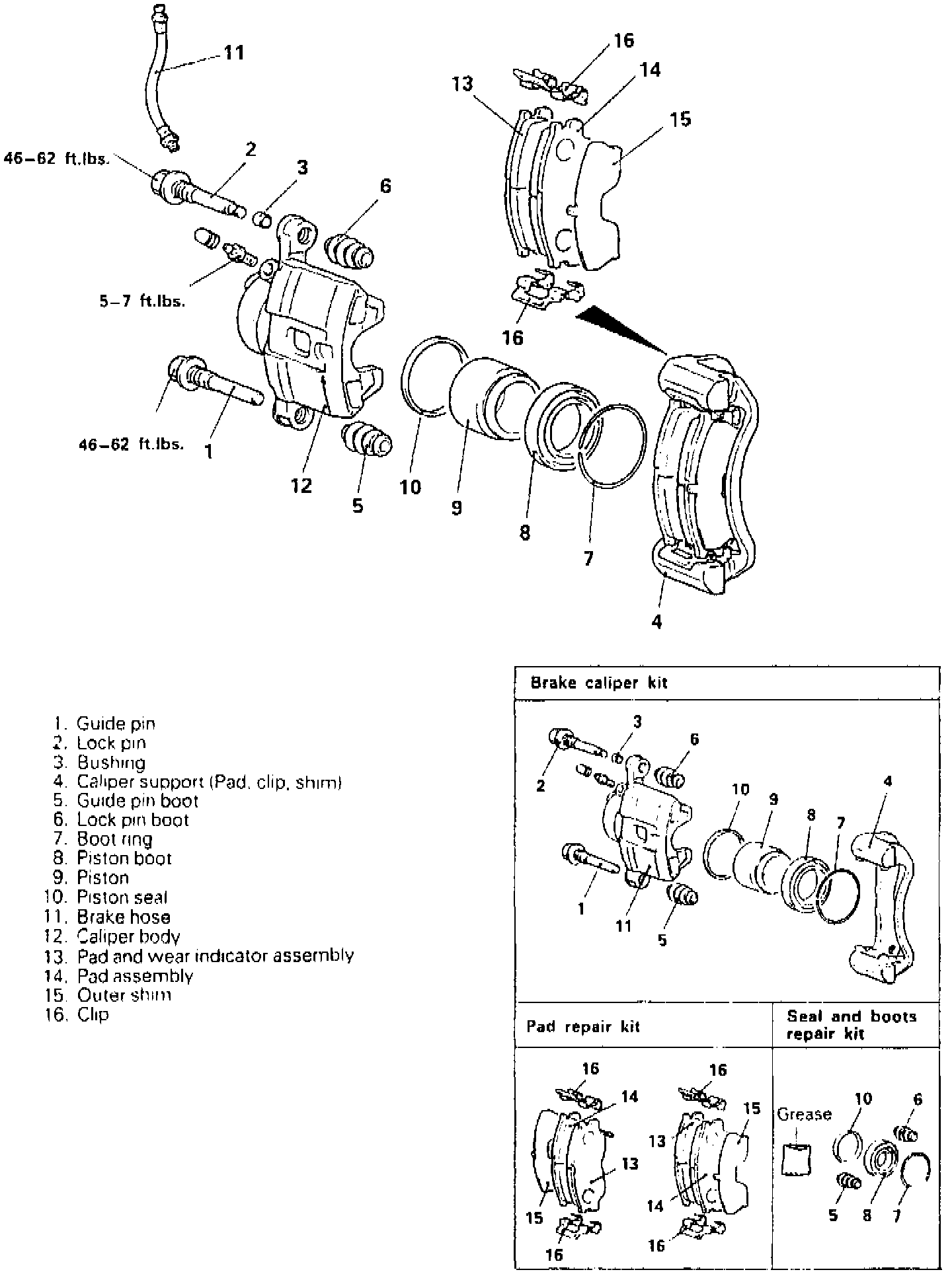 e. Lubricate sliding surface of lockpin and guide pin boots, caliper support and bushing with grease from seal and boot repair kit.