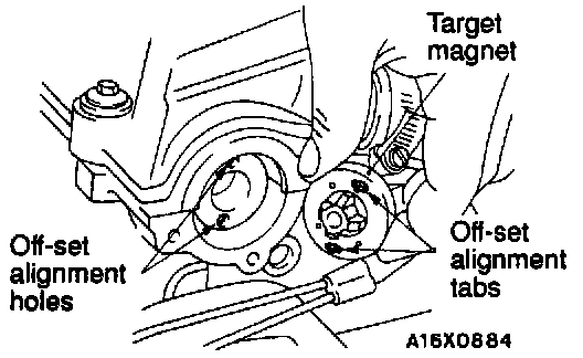 To install the target magnet, align the off-set tabs of the magnet with the off-set holes of the camshaft.