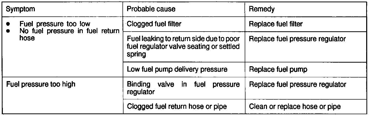 8. Turn the ignition switch off and observe fuel pressure gauge reading. Normal if the reading does not drop within 2 minutes. If it does, observe the rate of drop and troubleshoot and repair according to the table below.