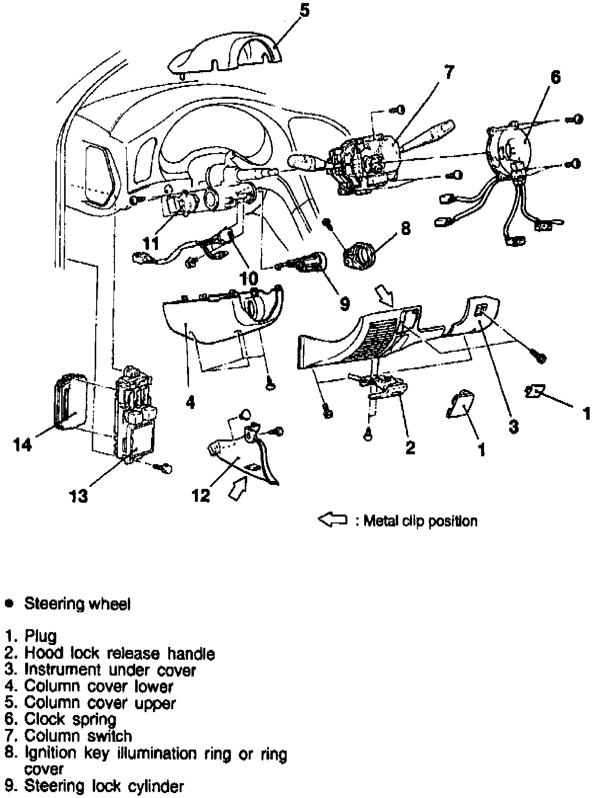 12. Reverse procedure to install. Refer to "Supplemental Restraint Systems" for clockspring installation procedure.