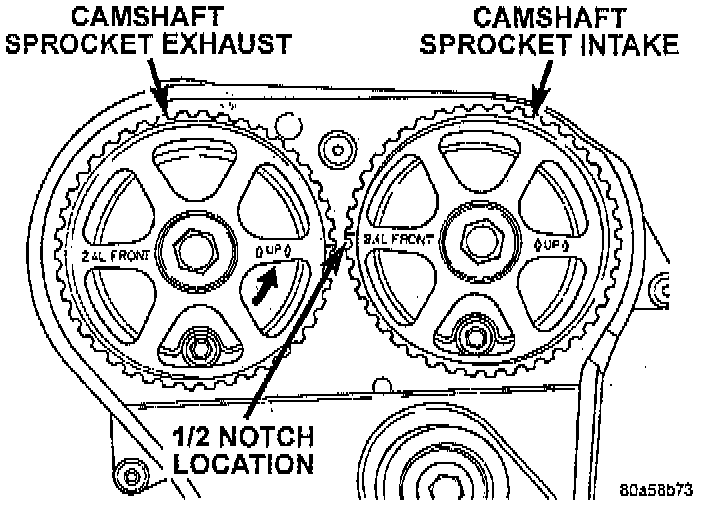 2. Set camshafts timing marks so that the exhaust camshaft sprocket is a 1/2 notch below the intake camshaft sprocket.