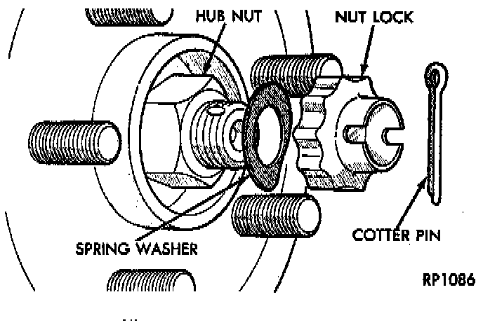1. Remove cotter pin, nut lock, and spring washer from the front stub axle.