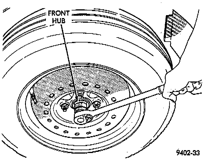 2. Loosen hub nut while vehicle is on the floor with the brakes applied. The hub and driveshaft are splined together through the knuckle (bearing) and retained by the hub nut.