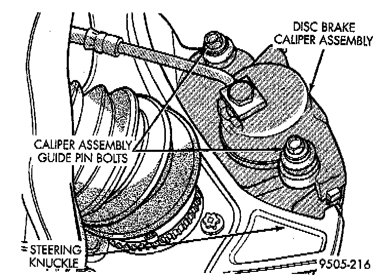 6. Remove disc brake caliper assembly from steering knuckle. Caliper is removed by first lifting bottom of caliper away from steering knuckle, and then removing top of caliper out from under steering knuckle.