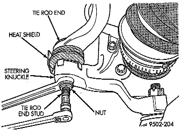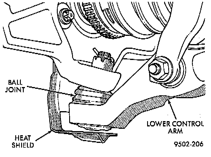 9. If vehicle is equipped with 15 inch wheels, remove lower ball joint heat shield from lower control arm. Heat shield must be removed before attempting to separating ball joint stud from steering knuckle.