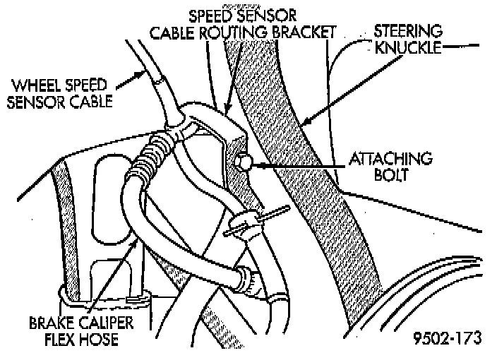 12. If equipped with antilock brakes remove the speed sensor cable routing bracket from the steering knuckle.