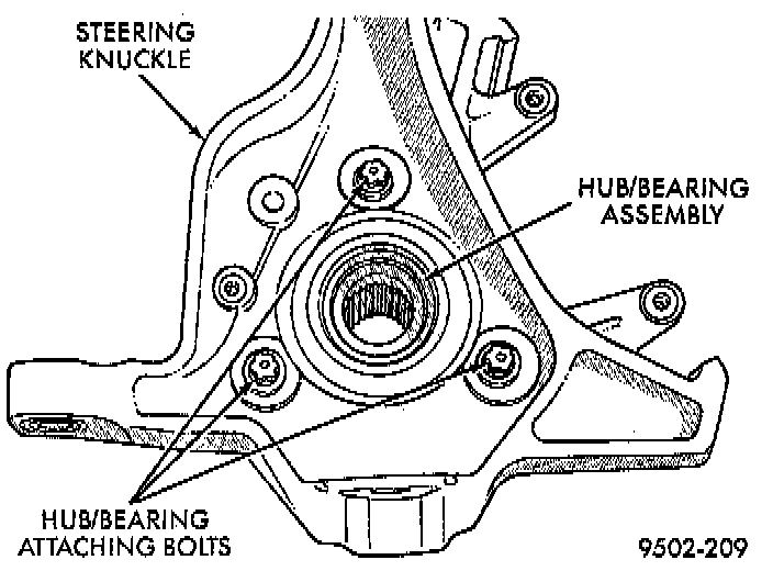 24. Install the replacement hub/bearing assembly in steering knuckle aligning bolt boles in bearing flange with holes in steering knuckle.