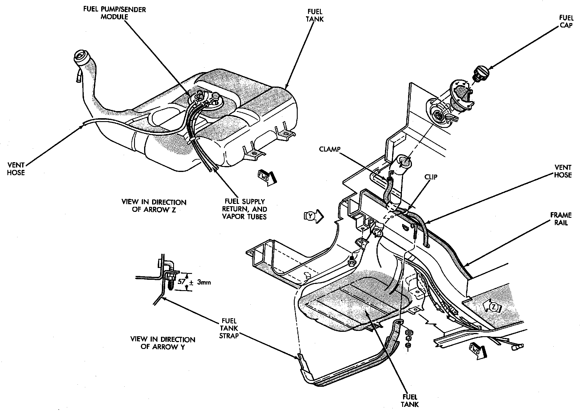 18. Slightly lower front of fuel tank. Slide tank away from crossmember while pushing filler and vent tube over crossmember.