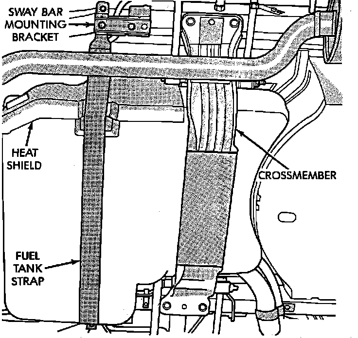 14. Remove sway bar mounting bolts, heat shield, and fuel tank strap.