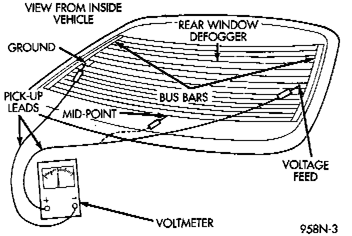 4. Connect negative lead of voltmeter to terminal A on passenger side bus bar and touch each grid line at Mid-Point with positive lead. A reading of approx 6 Volts indicates a line is good. A reading of 0 Volts indicates a break in line between Mid-Point C and terminal B. A reading of 10 - 14 Volts indicates a break between Mid-Point C and ground terminal A. Move toward break and voltage will change as soon as break is crossed.
