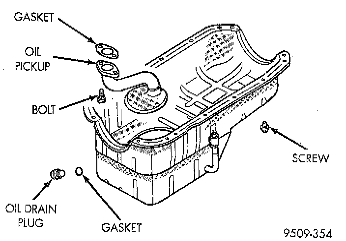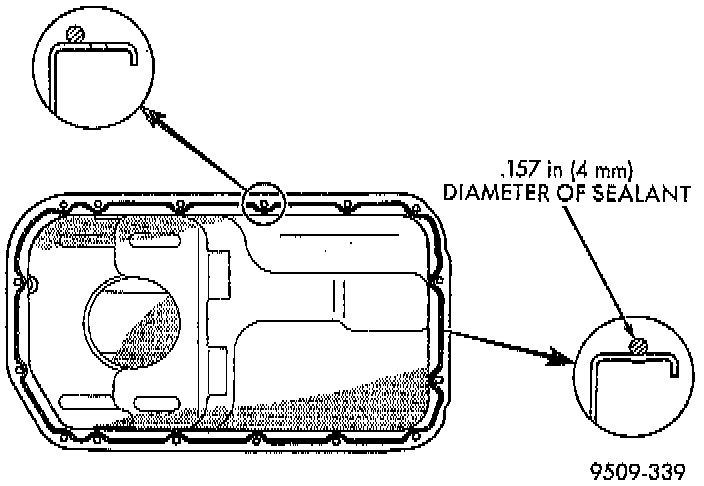 NOTE: Oil pan to cylinder block sealing is provided with Mopar Silicone Rubber Adhesive Sealant or equivalent gasket material.