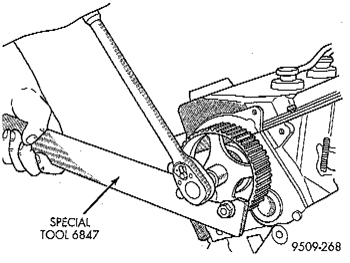 2. Hold camshaft sprocket with Special Tool 6847, or equivalent loosen and remove bolt and washer.
