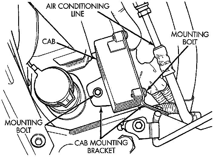 3. Remove the 2 bolts attaching the CAB mounting bracket to inner fender and front upper crossmember.