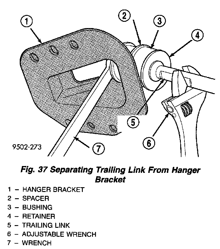 6. Separate the trailing link from the hanger bracket. To separate trailing link from hanger bracket, use a large adjustable wrench on flat of trailing link to turn link while holding nut stationary.