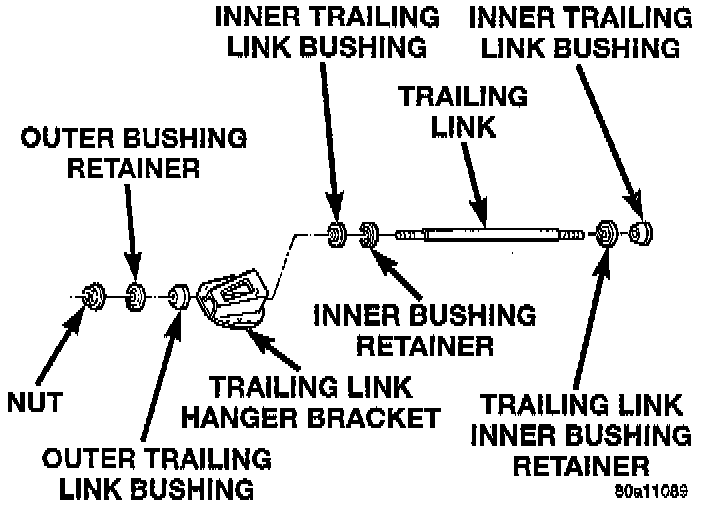 1. Install the inner bushing retainer, and inner bushing on the trailing link. Install the trailing link, retainer and bushing on the hanger bracket. Then install the outer bushing, outer bushing retainer and nut on the trailing link. Tighten the trailing link retaining nut to a torque of 99 Nm (73 ft. lbs.).