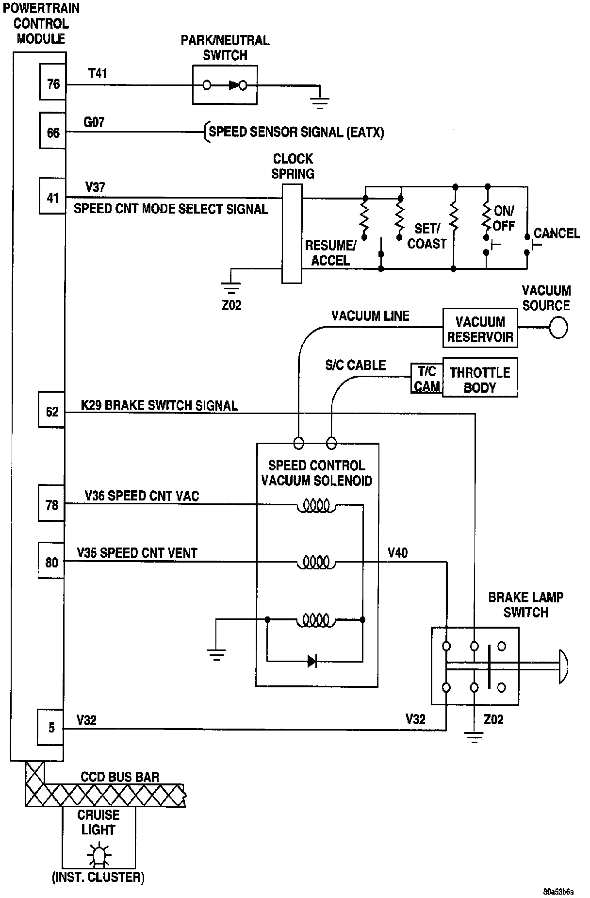 Electronic speed control systems may be tested using two different methods. One involves use of a DRB. If this test method is desired, refer to the Powertrain Management/Computer and Control Systems/Test Procedures for charging and speed control system.The other test method uses a volt/ohm meter. The volt/ohm meter method is described in the following tests.