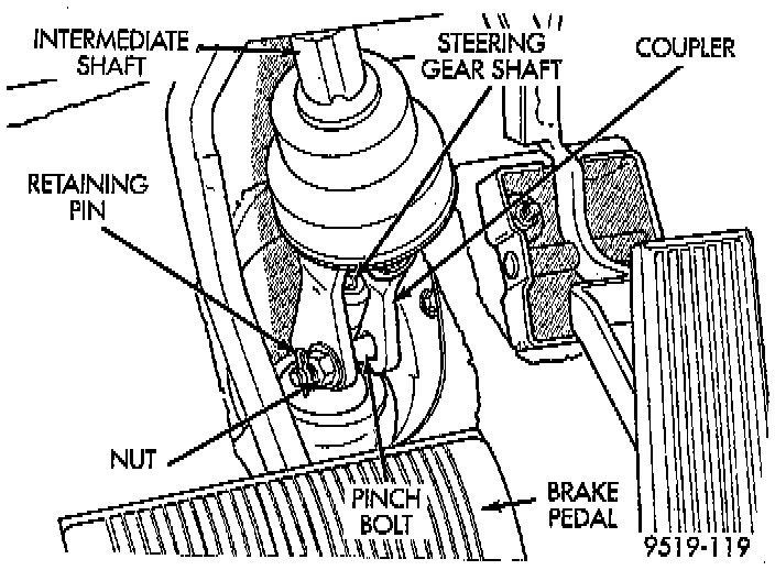 4. Ensure front wheels of vehicle are positioned straight-ahead, and steering wheel master serration in steering column shaft is positioned at 12 O'clock. Then assemble the lower intermediate shaft coupler to the steering gear input shaft. Tighten the coupler pinch bolt nut to a torque of 27 Nm (240 inch lbs.). Be sure to install steering coupler pinch bolt retaining pin.