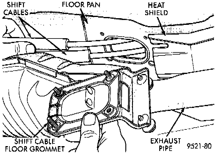 10. Disconnect shift cables from shifter. Pry with equal force on both sides of shifter cable isolator bushings to avoid damaging bushings.