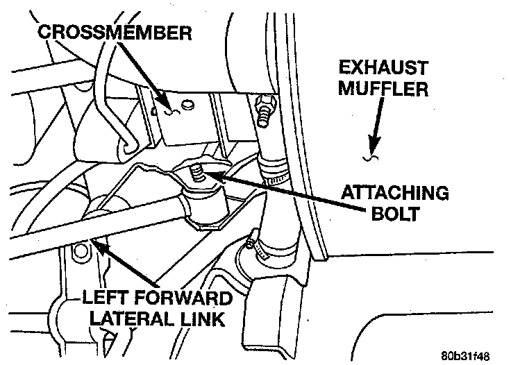 1. Attach the left forward lateral link to crossmember. Install mounting bolt through the front of the crossmember mount towards the rear. Install the lateral link attaching nut, but DO NOT fully tighten at this time.