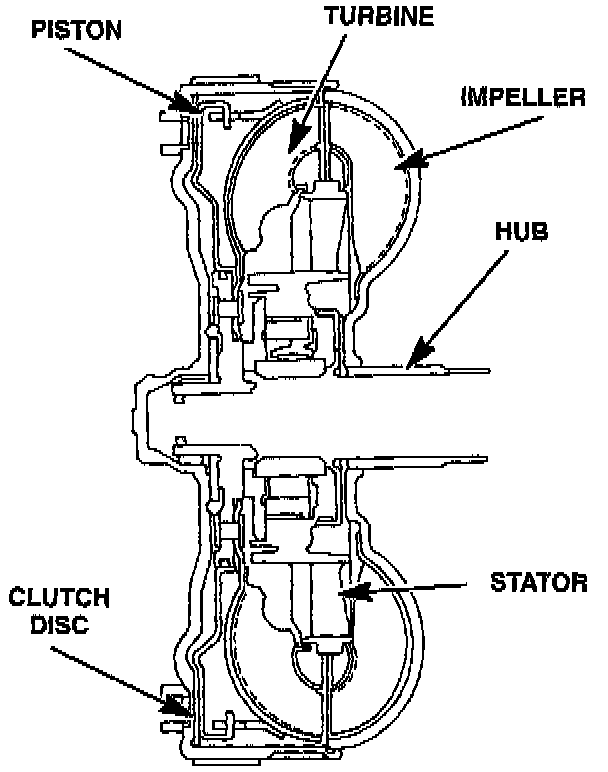 The torque converter is similar in function and design to other Chrysler torque converters. The 42LE uses a crescent type gear pump. The torque converter clutch engages or disengages the turbine assembly to the impeller housing. The application of the converter clutch is controlled electronically by the solenoid assembly and valve body. The torque converter transmits torque from the engine crankshaft to the input shaft of the transaxle.