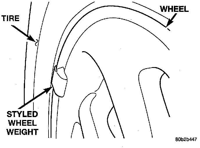 This vehicle uses a styled weight. This wheel weight is designed to fit the contoured surface of the wheel. When balanceing, this wheel weight must be used. Do not use any other type of wheel weight. It will not properly fit the contour of the wheel.