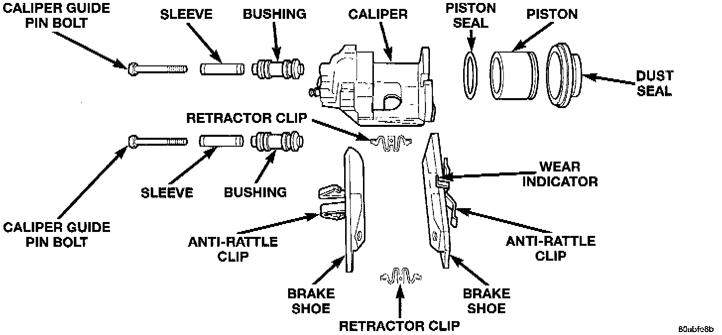 Check the caliper dust boot and caliper pin bushings to determine if they are in good condition. Replace if they are damaged, dry, or found to be brittle.