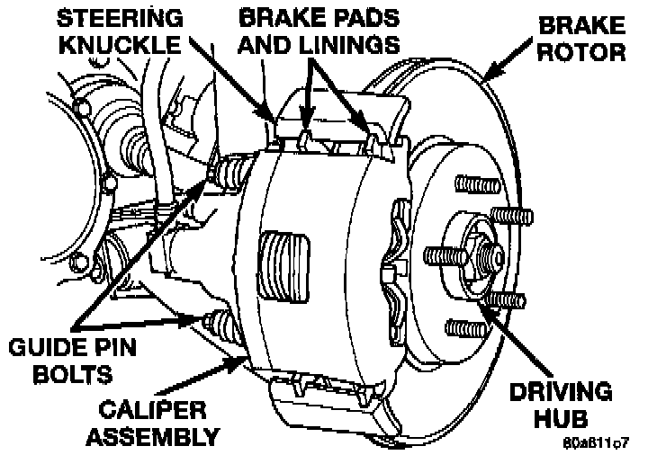 Two machined abutments on the steering knuckle position the caliper. The guide pin bolts, sleeves and bushings control the side to side movement of the caliper. The piston seal is designed to pull the piston back into the bore of the caliper when the brake pedal is released. This maintains the proper brake shoe to rotor clearance.