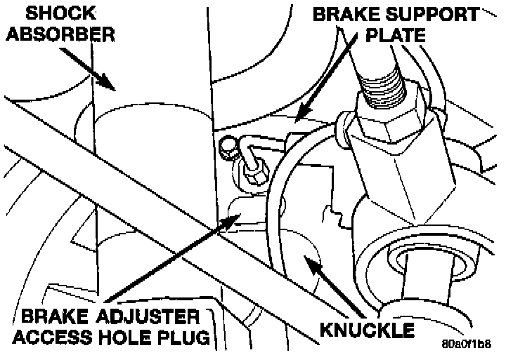Place the vehicle on a frame contact hoist with a helper in the driver's seat to apply the brakes. Raise the vehicle. Remove the adjuster access hole plug, from the rear brake support plate. This will allow access to the star wheel on the automatic adjuster mechanism. Then, to eliminate the possibility of maximum adjustment, insert a small screwdriver through the access hole in the support plate and back off the adjuster star wheel approximately 10 notches. It will be necessary to hold the adjuster lever away from the star wheel to perform this adjustment procedure.