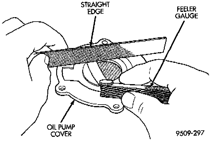 2. Lay a straightedge across the pump cover surface. If a 0.025 mm (0.001 inch) feeler gauge can be inserted between cover and straight edge, cover should be replaced.