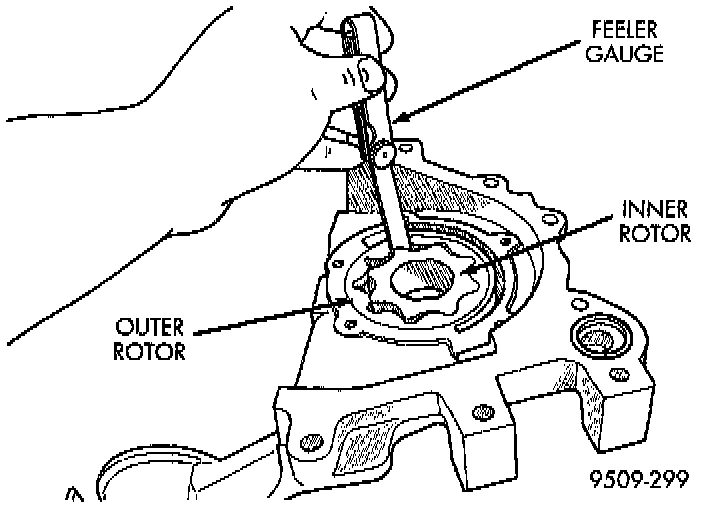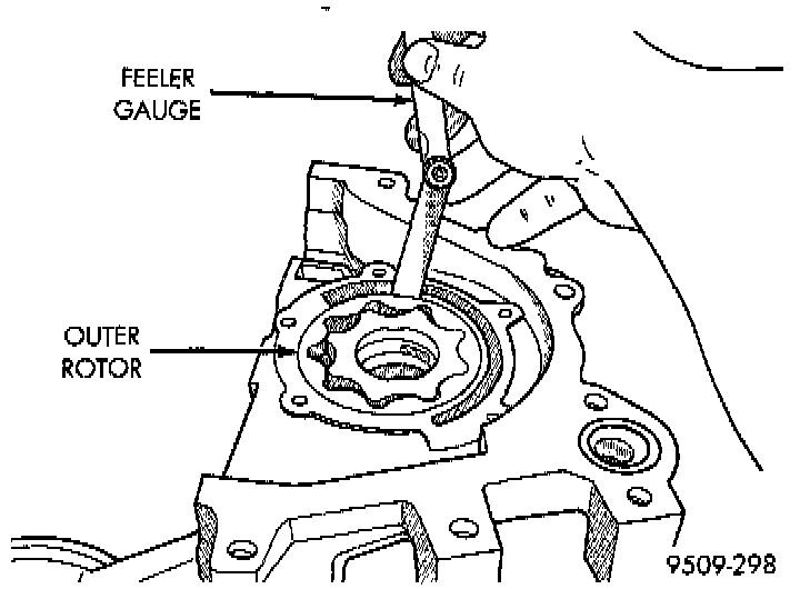 5. Slide outer rotor into pump housing, press to one side with fingers and measure clearance between rotor and housing. If measurement is 0.39 mm (0.015 inch) or more, replace housing only if outer rotor is in specification.