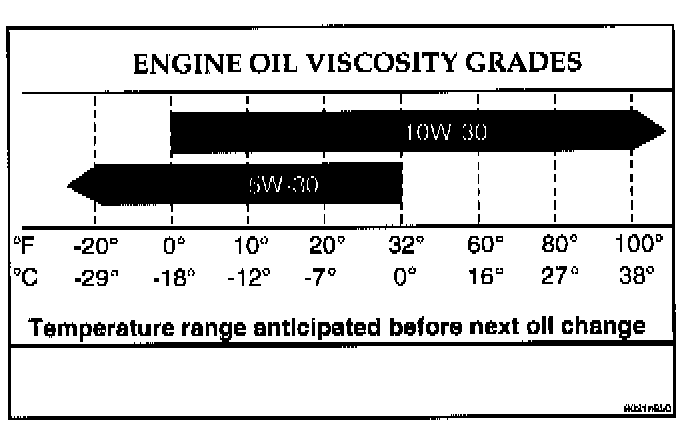 An SAE viscosity grade is used to specify the viscosity of engine oil. Use only engine oils with multiple viscosities such as 5W-30 or 10W-30. These are specified with a dual SAE viscosity grade which indicates the cold-to-hot temperature viscosity range. Select an engine oil that is best suited to your particular temperature range and variation.