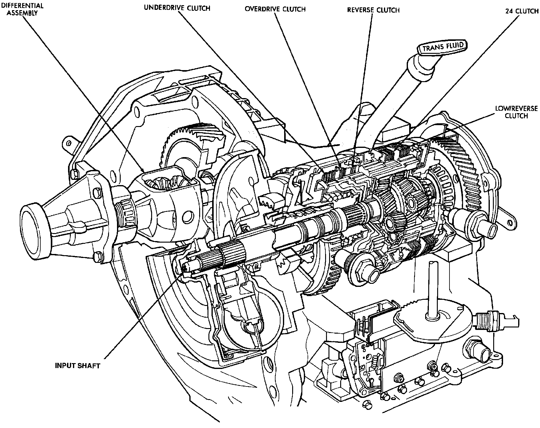 The hydraulics also include a unique logic-controlled "solenoid torque converter clutch control valve". This valve locks out the 1st gear reaction element with the application of 2nd, direct, or overdrive gear elements.