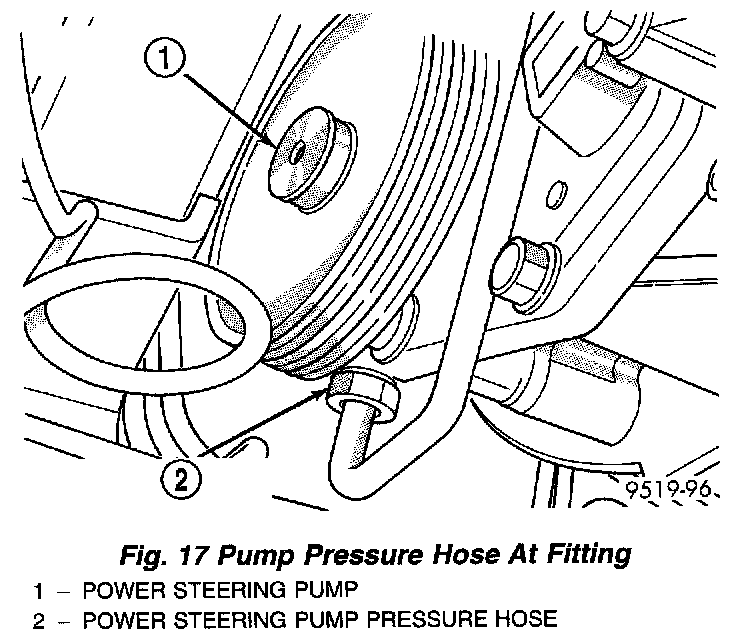 2. Disconnect power steering fluid pressure hose, at power steering pump. Use a container for dripping fluid.