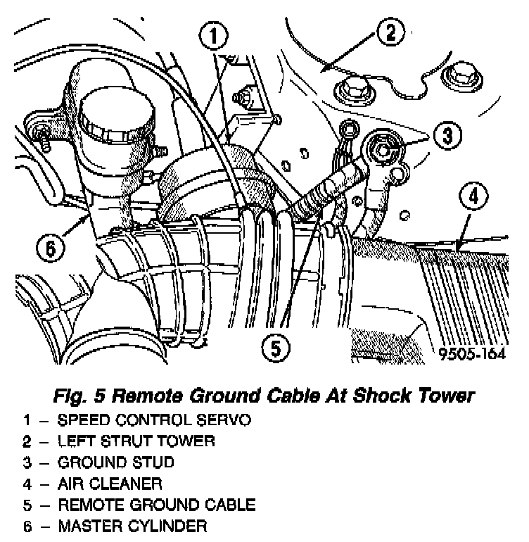 1. Remove remote ground cable from ground stud on shock tower. Then correctly isolate ground cable from vehicle by installing isolator on stud.