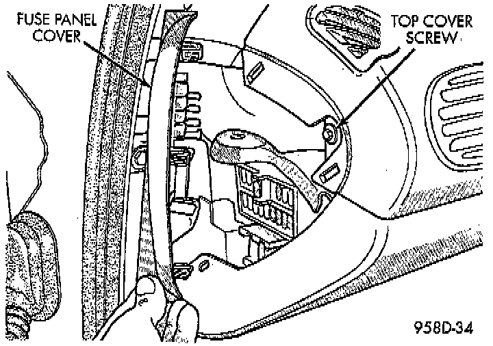 4. Remove fuse panel cover from left end of instrument panel. Then remove the screw behind fuse panel cover, attaching the instrument panel top cover.