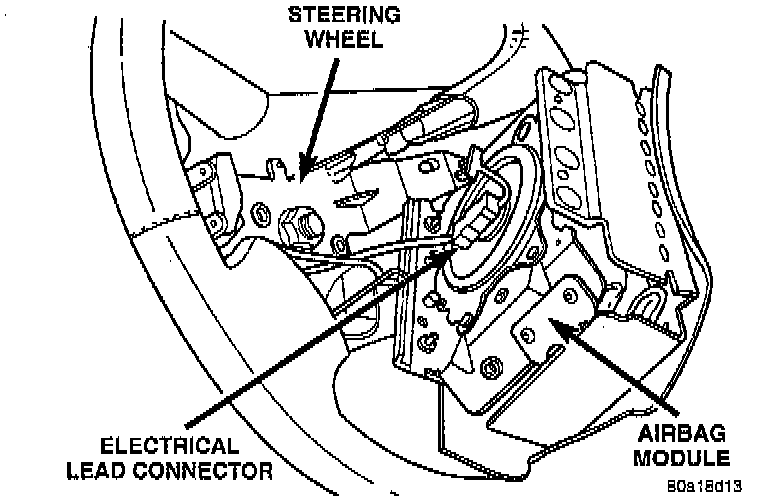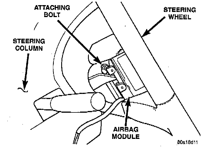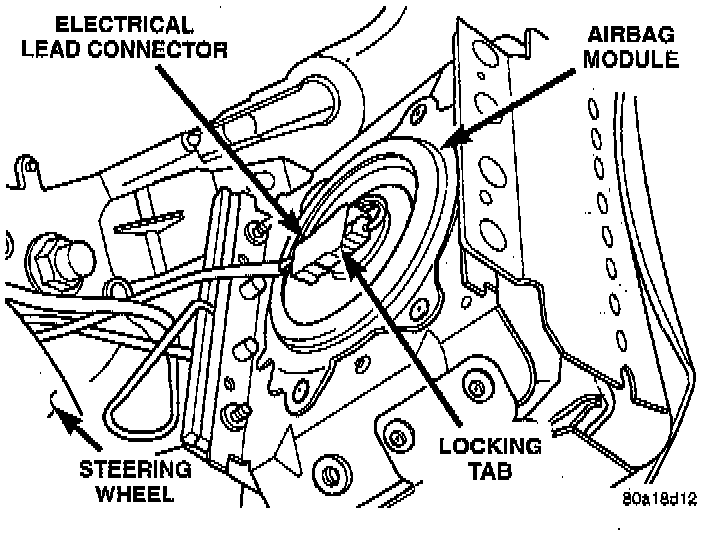 WARNING: When handling an undeployed airbag module during servicing of the steering column the following precautions should be observed. At no time should any source of electricity be permitted near the inflator on the back of the airbag module. When carrying a live module, the trim cover should be pointed away from the body to minimize injury if module accidently deploys. If airbag module is placed on a bench or other surface, plastic cover should be face up to minimize movement in case of accidental deployment.
