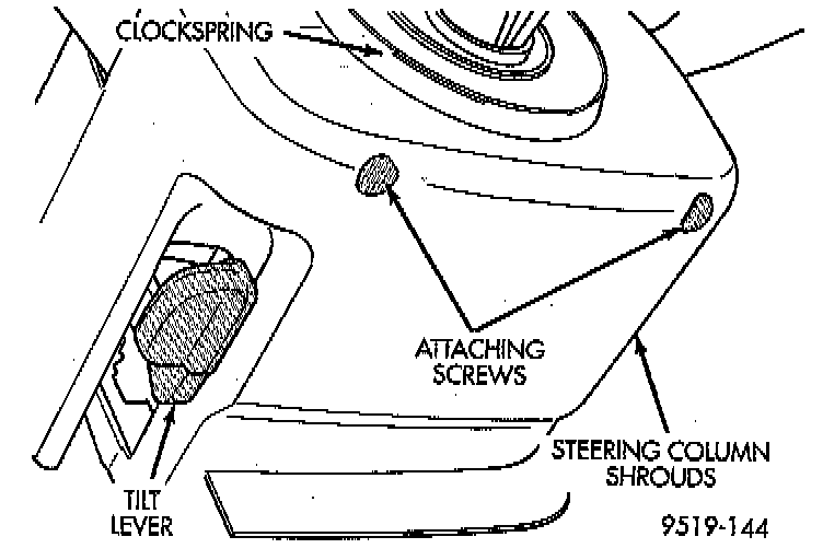 21. Remove the 2 screws attaching the upper and lower shrouds to the steering column. First remove upper shroud from steering column, then release tilt lever and tilt steering column to its highest point. Then remove lower shroud from steering column.