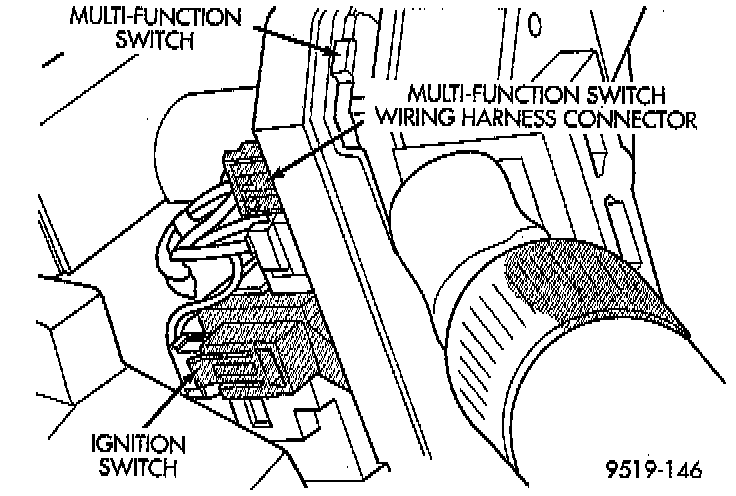 24. Remove the 2 wire wiring harness connectors from the back of the ignition switch. Then remove the 2 wiring harness connector from the multi function switch.
