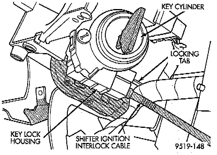 25. Depress the locking tab on the shifter/ignition interlock cable and remove the cable from the key lock housing.