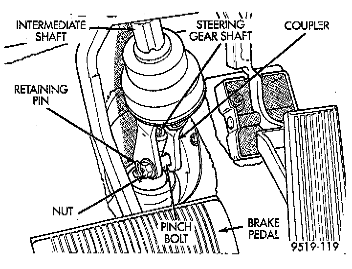 28. Remove retaining pin in steering column coupler pinch bolt. Loosen the upper to lower steering coupler pinch bolt retaining nut and remove pinch bolt from steering coupler. Pinch bolt nut is caged to coupler and is not removable. Then separate steering coupler from Steering gear.