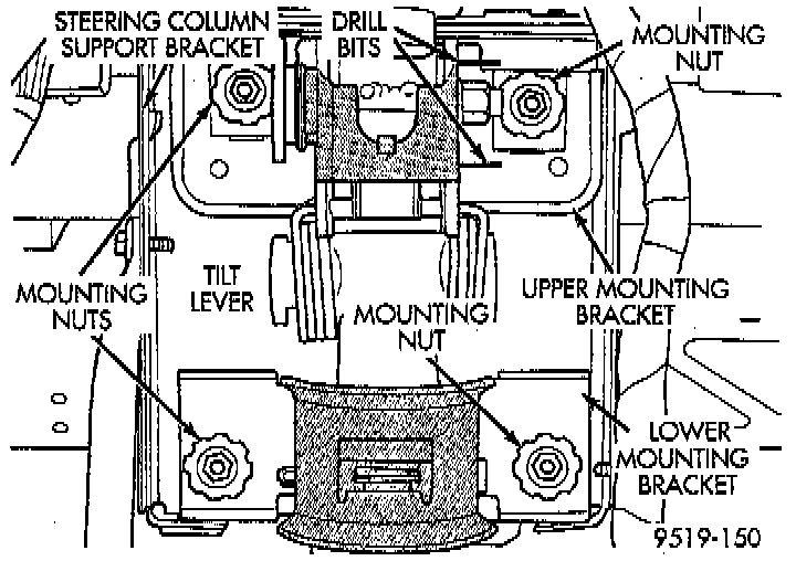 29. Place steering column so it is positioned in the middle of its tilt range. Place the steering column assembly tilt lever in its fully locked position. Then insert a 5/32 inch drill bit in each locking pin hole on the upper steering column mounting bracket.