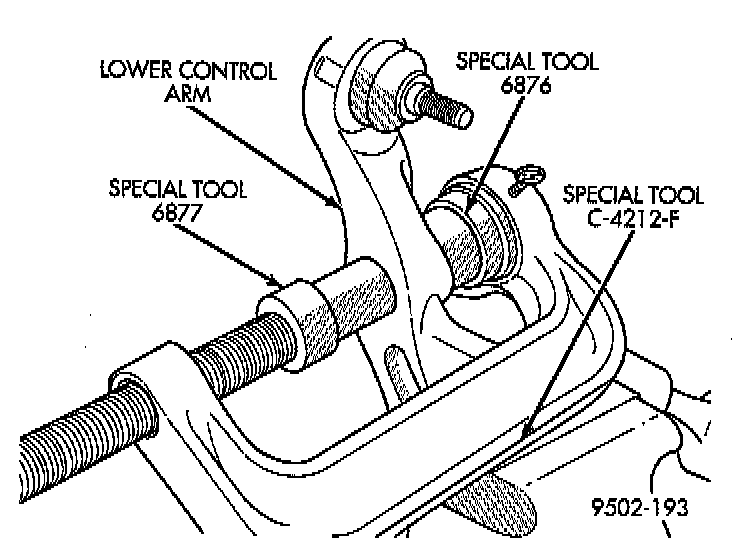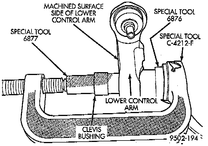 3. Install the assembled special tools for installing the clevis bushing into the lower control arm, on the lower control arm and clevis bushing. Be sure Special Tool 6876, or equivalent is square on lower control arm and Special Tool 6877, or equivalent is positioned correctly on clevis bushing.