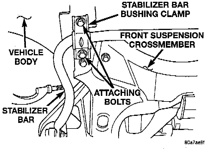 1. Position stabilizer bar and bushings as an assembly into front crossmember. Install the stabilizer bar bushing retainer to crossmember and body attaching bolts.