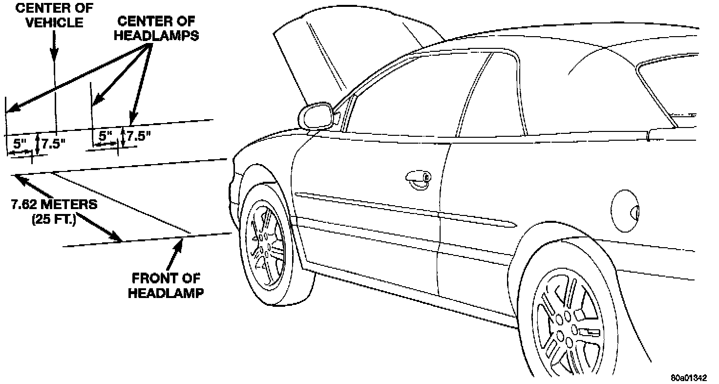 1. Position vehicle on a level surface perpendicular to a flat wall 7.62 meters (25 ft.) away from front of headlamp lens.
