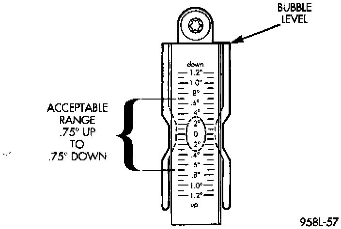 A properly aimed low beam headlamp will project the center of the low beam hot spot on the alignment screen 190 mm (7.5 in.) below the headlamp centerline. The side-to-side low beam hot spot should be 127 mm (5 in.) right of headlamp centerline. The preferred headlamp alignment is 0 (± 0.76°) for the up/down adjustment as indicated on bubble level. Preferred left/right alignment is 0 (±0.76°) as indicated on the gauge wheel. The high beam headlamps cannot be aligned. The high beam pattern should be correct when the low beams are aligned properly.